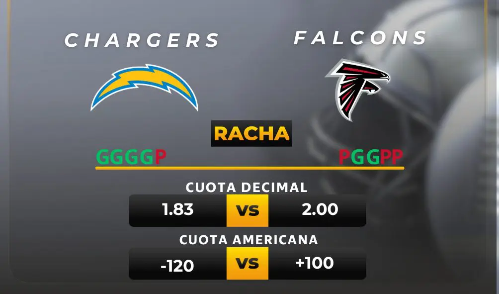 Es por ello que en MiCasino.com preparamos el pronóstico, apuestas deportivas y resultados para este partido Chargers vs Falcons de NFL con la que podrás cobrar dinero fácil este fin de semana. ¡Continúa leyendo y no dejes pasar la oportunidad de llenar tus bolsillos con las mejores cuotas de Latinoamérica!