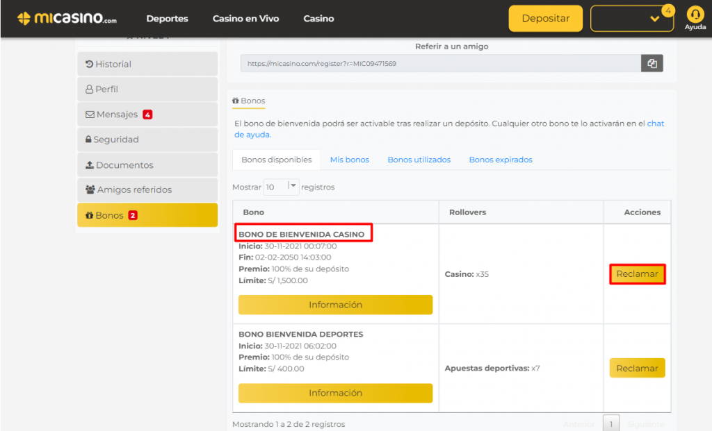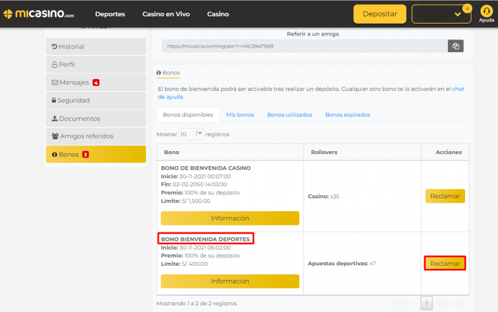 3 – Para finalizar, en el panel de usuario selecciona “Bonos” y en esta sección podrás escoger el bono de bienvenida de casino o deportes.