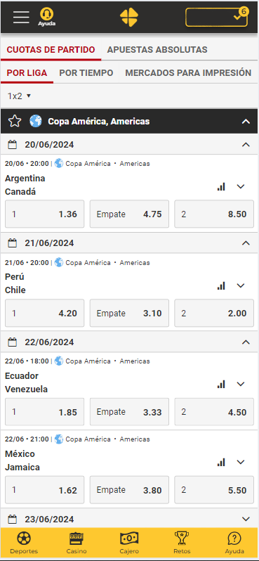 - Las apuestas complejas, como hándicap, mayor/menor, ambos equipos anotan, goles totales y apuestas en vivo no son válidas. Al igual que las apuestas en eventos virtuales y en la sección de hipismo nacional o internacional.