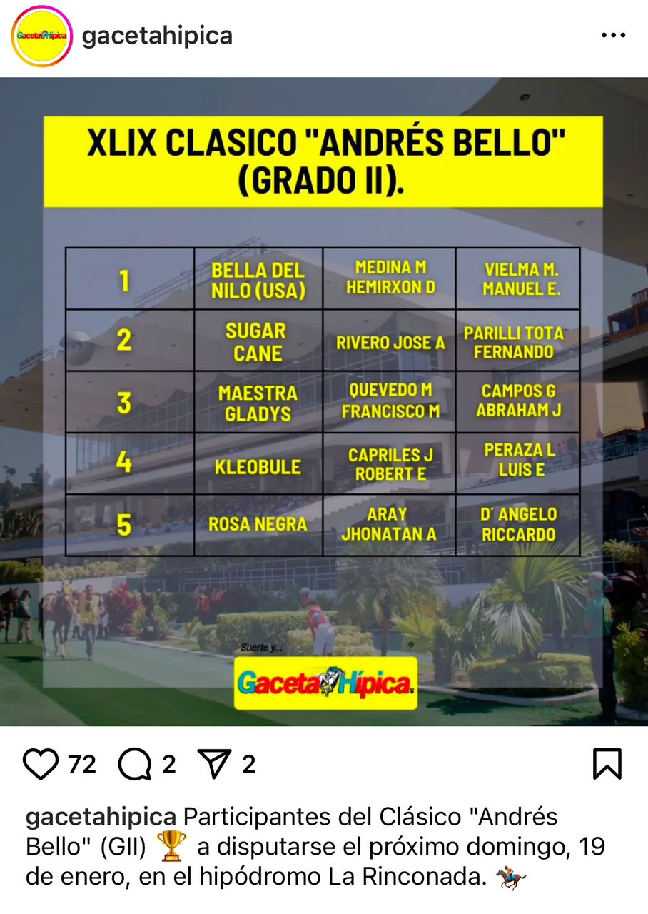 El Hipódromo La Rinconada en Caracas, albergará la segunda selectiva de esta jornada inicial, con el Clásico Andrés Bello (G2), una competencia preparada para potrancas de tres años en 1.400 metros, en la que participarán: