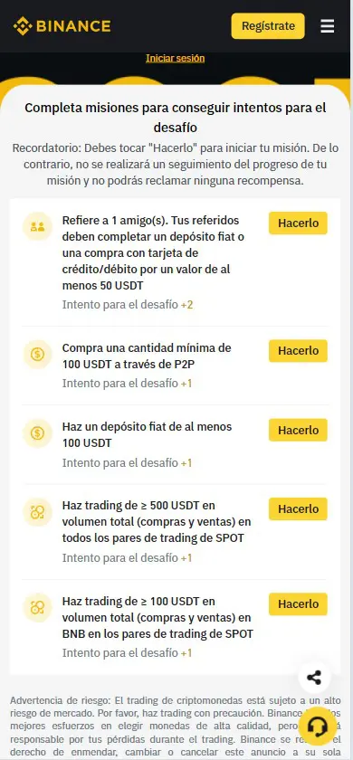 Para participar en el sorteo, es necesario completar varias misiones en la plataforma, mismas que estarán activas hasta el 15 de junio. Cada una de estas misiones tiene un número limitado de intentos. Para poder calificar y optar por ser uno de los ganadores de los 200 BNB que sorteará Binance deberás cumplir correctamente con los retos impuestos que te diremos a continuación.