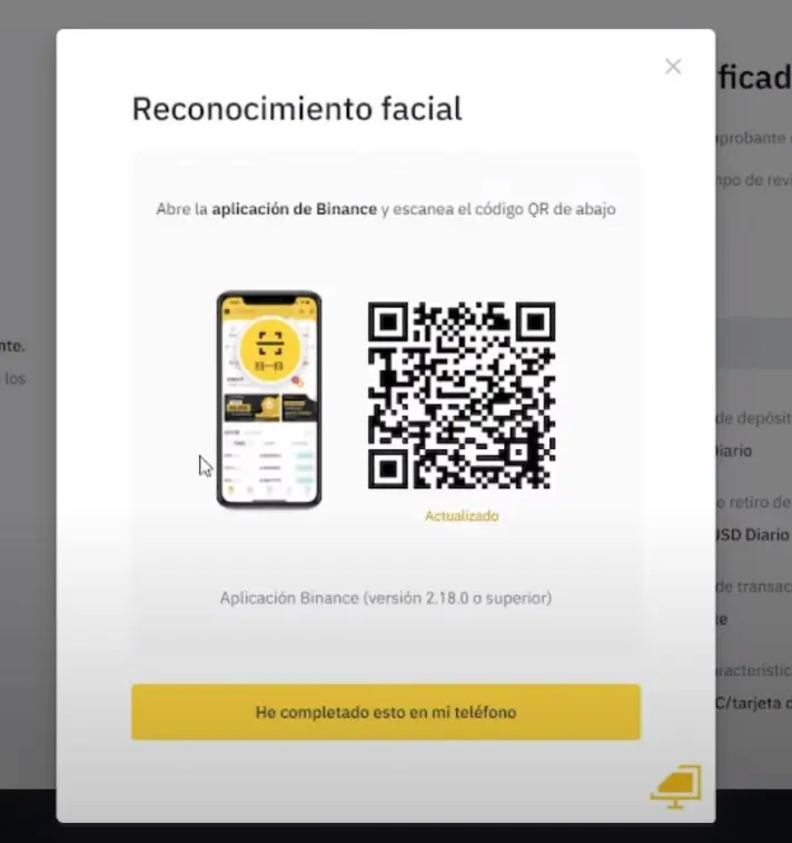 Si estás haciendo la verificación desde la computadora, como alternativa, puedes mover el mouse hacia el código QR que se encuentra en la esquina inferior derecha para completar este paso de la verificación en la aplicación de Binance. Escanea el código QR con tu equipo móvil a través de tu aplicación de Binance para finalizar el proceso de verificación facial.