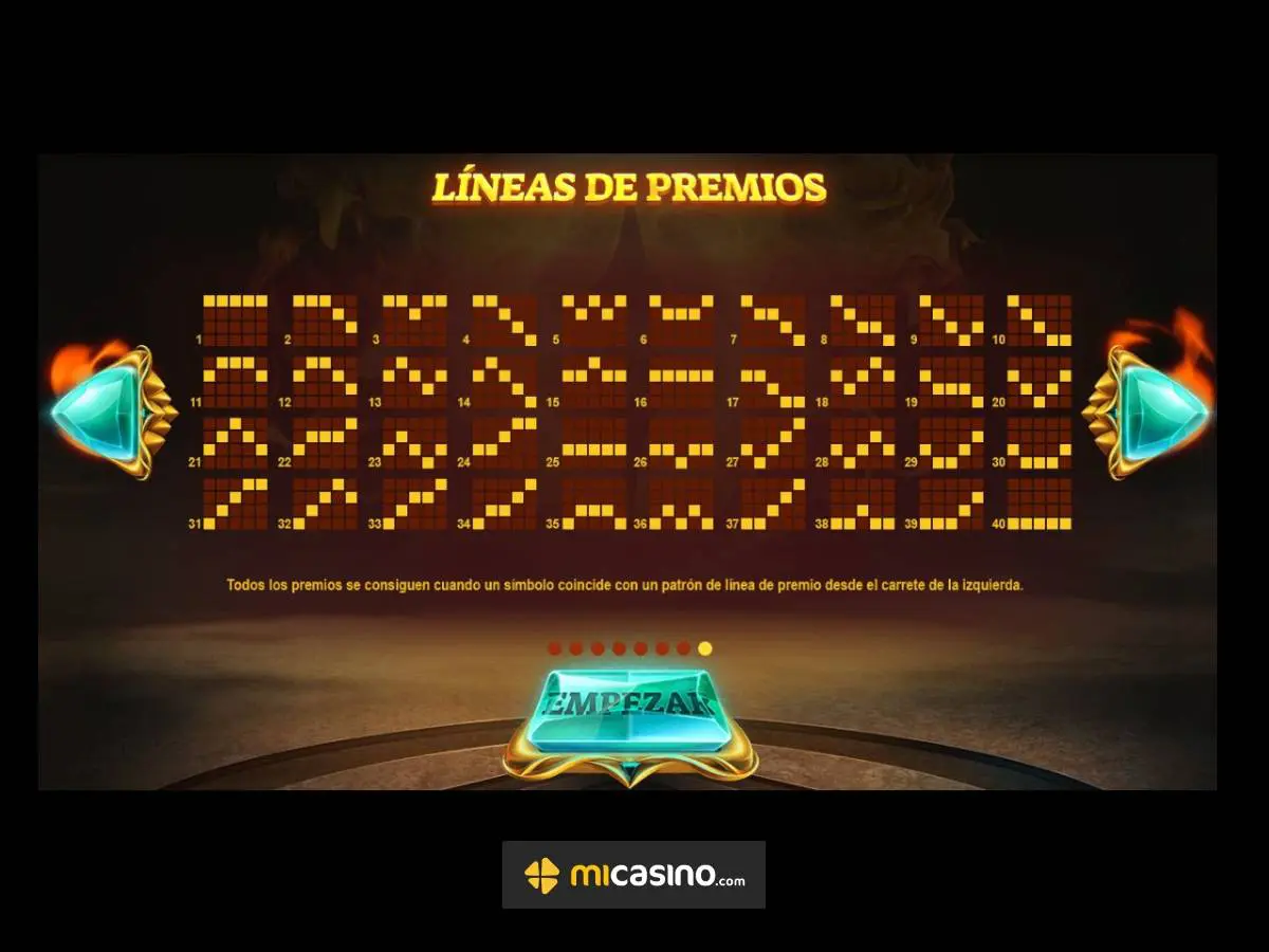 Dragons Fire cuenta con 5 carretes, 4 columnas y 40 líneas de pago. Necesitarás establecer tu apuesta antes de empezar a jugar. En MiCasino.com, la apuesta mínima es de 0.50 y la apuesta máxima es de 180.00. El valor de la ganancia dependerá de los símbolos que consigas en cada jugada.
