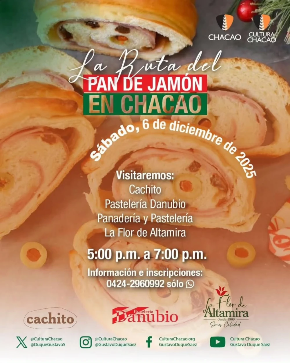 La Ruta del Pan de Jamón en Chacao es uno de los más esperados eventos gratis en Caracas hoy, así que no te pierdas el tour que se llevará a cabo el próximo sábado 6 de diciembre de 2025, en un horario desde las 5:00 P.M. hasta las 7:00 P.M.