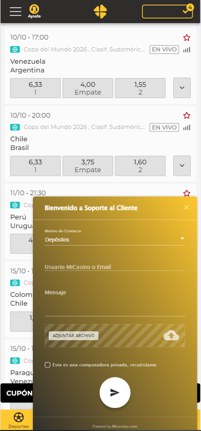 Como puedes ver, participar es muy fácil, solo deberás reclamar al chat de MiCasino.com tu Bono Mundial durante los días 9 y 15 de octubre y recibirás el 35% extra en tu siguiente depósito con un rollover de x21 para realizar tus apuestas en Deportes y Casino. Recuerda que en estas fechas se vivirá la emoción de las Eliminatorias CONMEBOL.