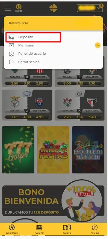 Después de iniciar sesión en la página, se debe dar clic en el botón que muestra el saldo, ubicado en la parte superior a mano derecha. Luego de esto, se desplegará un menú, aquí se debe pulsar donde dice “depósito” y luego ir a donde dice “retiro” que es la que nos interesa.