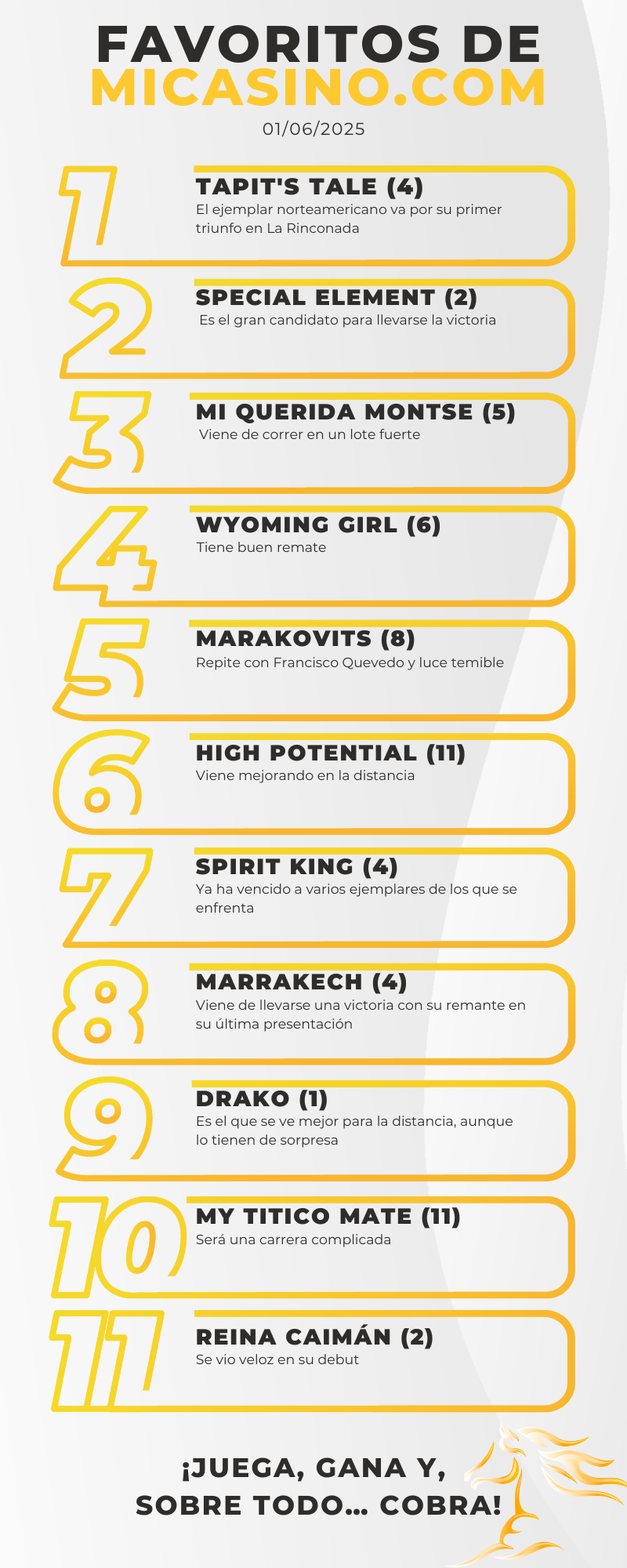 El hipismo venezolano sigue cautivando a los apasionados de la velocidad y la estrategia, y este domingo, 1 de junio, favoritos 5y6 La Rinconada se convierte en el escenario de una jornada imperdible. Siendo el primer día del mes, las carreras prometen emoción y grandes oportunidades para los apostadores. En MiCasino.com, contamos con los favoritos 5y6 La Rinconada para ganar, brindándote la mejor información para potenciar tus pronósticos y multiplicar tus ganancias. Además, nuestros Datos hipismo venezolano te ofrecen información clave para que tomes las mejores decisiones al apostar.
