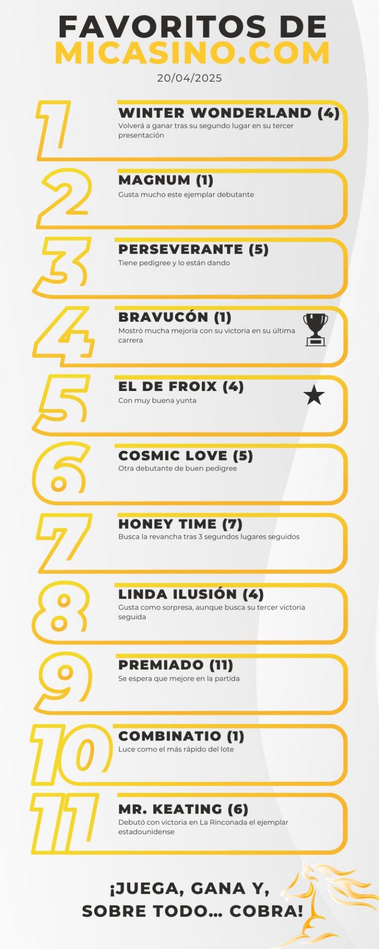 No te pierdas esta oportunidad de vivir los Favoritos de La Rinconada este domingo, apoyándote en los datos exclusivos y confiables que te ofrecemos en MiCasino.com para optimizar tus pronósticos y asegurar una experiencia emocionante y enriquecedora. Aprovecha cada carrera para vivir momentos memorables y disfrutar de la adrenalina que caracteriza al hipismo, en un ambiente lleno de emoción y tradición.