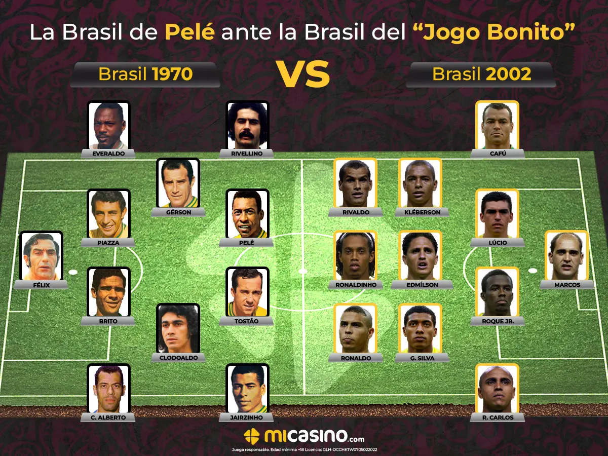 El momento de la verdad ha llegado en MiCasino.com para descubrir quién es la mejor selección brasileña, si el equipo de Pelé o el de Ronaldo. Los jugadores de 1970 lograron un rendimiento de 100 % de efectividad en seis 6 juegos y 12 puntos logrados, con 19 goles a favor y solo siete en contra.
