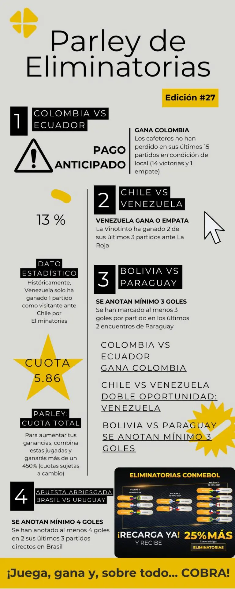 Aprovecha esta jornada llena de emociones y realiza tus apuestas en nuestro casino online. Contamos con las mejores cuotas para cada uno de estos partidos y nuestra exclusiva herramienta de “pago anticipado”, que te permite ganar incluso si tu equipo se adelanta en el marcador. No te quedes fuera y vive la pasión y las apuestas de las eliminatorias Conmebol 2026 en MiCasino.com.
