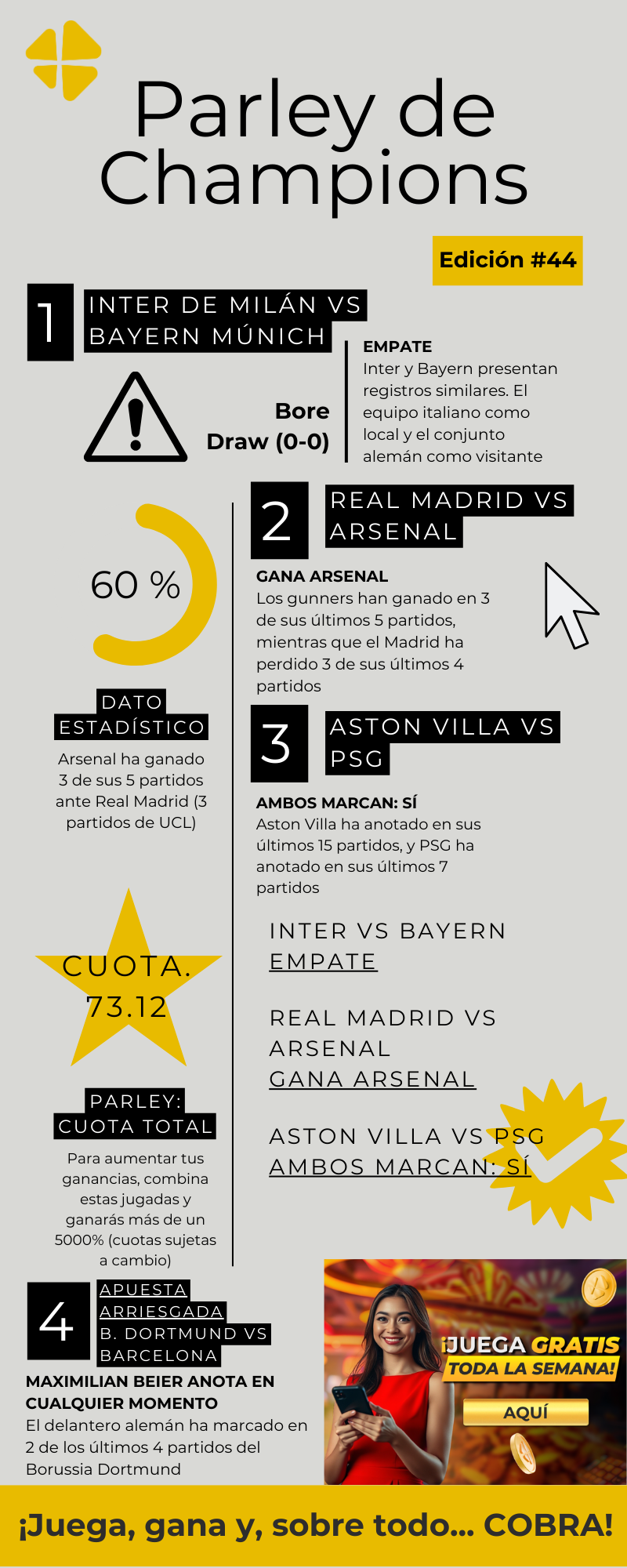 Este miércoles promete emociones y oportunidades para apostadores, con encuentros claves y estrategias fundamentadas en estadísticas. Aquí te presentamos un análisis detallado de los favoritos a ganar este partido de vuelta en la Champions League 2025. Aprovecha estas combinaciones estratégicas para maximizar tus resultados y disfruta de una jornada llena de acción. ¡Apuesta en grande y gana como un campeón en MiCasino.com, donde las cuotas y pronósticos te llevan directo a la victoria! No te pierdas esta oportunidad única para triunfar con tu Parley de Champions.