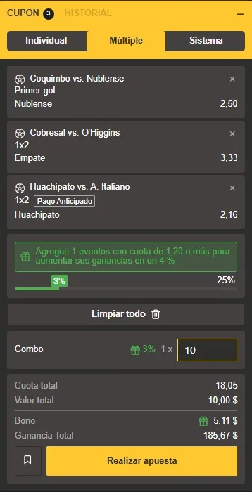 No dejes pasar esta oportunidad de oro donde puedes ganar bastante dinero siguiendo el pulso del fútbol chileno. Nuestra recomendación del domingo ofrece una cuota sumamente atractiva: con un depósito de apenas $10 en nuestro casino online, podrías llegar a cobrar alrededor de $185.