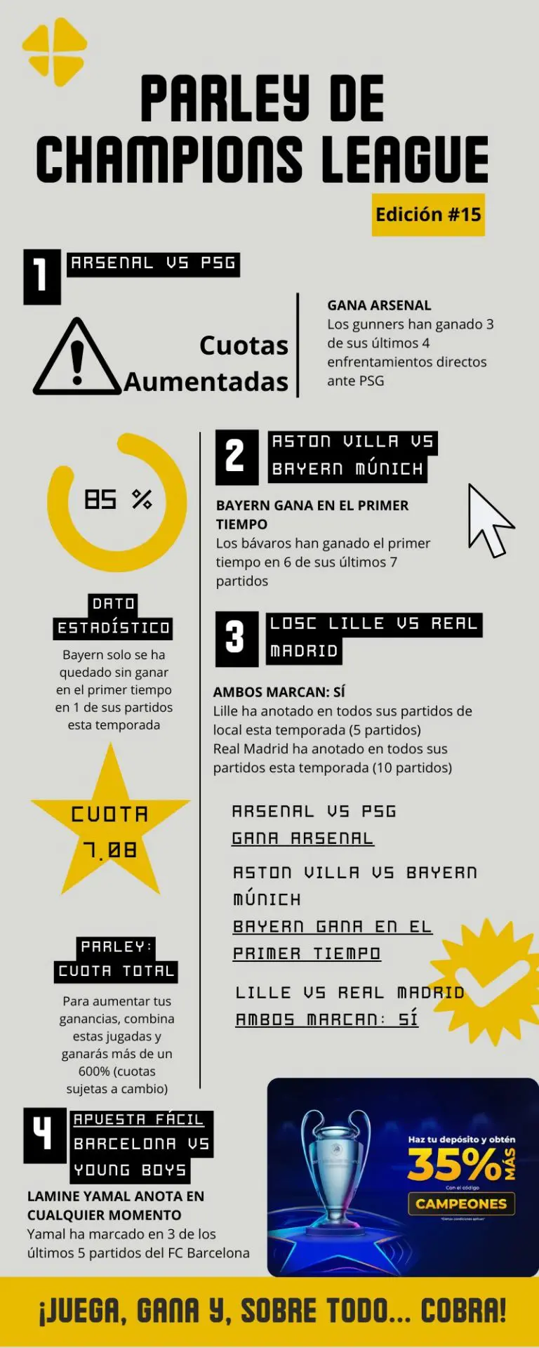 ¡La jornada 2 de la Champions League está llena de emoción y grandes oportunidades para ganar! Te invitamos a revisar el parley que hemos preparado con los encuentros más esperados de esta fase. Además, en nuestro casino online, ofrecemos cuotas aumentadas que se activarán cuatro horas antes de cada partido. Apuesta en los vibrantes duelos entre Arsenal vs PSG, Aston Villa vs Bayern Múnich, Lille vs Real Madrid y Barcelona vs Young Boys. No te pierdas la oportunidad de mejorar tus ganancias con estas cuotas exclusivas y disfrutar de una jornada llena de adrenalina. ¡Apuesta y gana en grande!