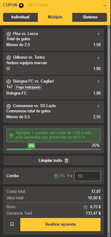 No dejes pasar esta oportunidad de oro donde puedes ganar bastante dinero con la pasión del fútbol italiano. La rentabilidad de esta combinación es excepcional: con un depósito de al menos $10 en nuestro casino online, podrías llegar a ganar alrededor de $133 si decides seguir nuestra recomendación experta.