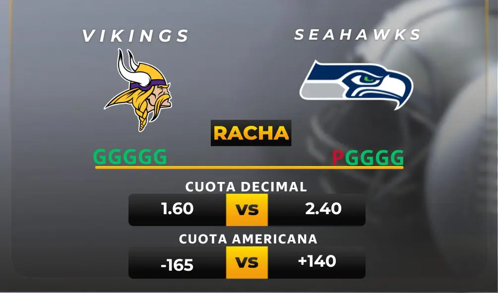 Seahawks están en la primera posición de la División Oeste de la Conferencia Nacional, mientras que los Vikings ocupan la segunda plaza de la División Norte y tienen asegurada su clasificación como uno de los comodines. Sin embargo, sus duelos directos han sido muy reñidos a lo largo de la historia, lo que nos invita a favorecer a los de casa en nuestro pronóstico deportivo. En todo caso, a continuación presentamos los datos más destacados y las cuotas de MiCasino.com para este fin de semana.