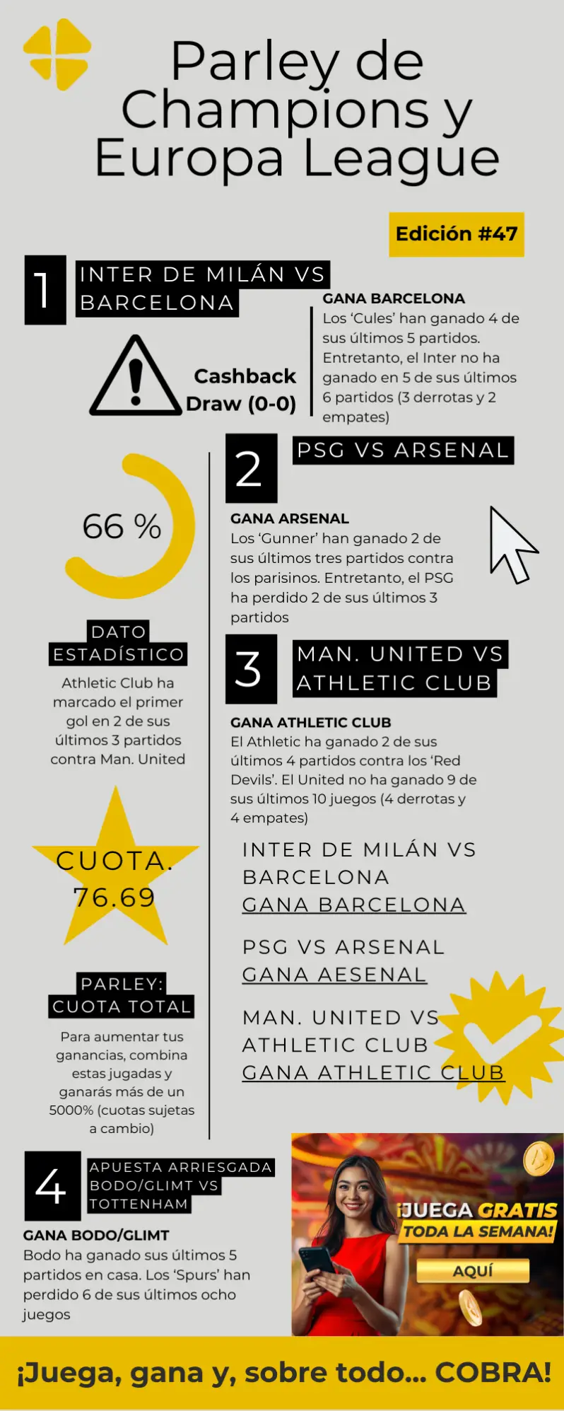 Llegan los partidos de vuelta de la Champions y Europa League, y con ellos, las definiciones más intensas del fútbol europeo con los duelos: Inter de Milán vs. Barcelona (martes, 6 de mayo); PSG vs. Arsenal (miércoles, 7 de mayo); Man. United vs. Athletic Club (jueves, 8 de mayo) y Bodo/Glimt vs. Tottenham (jueves, 8 de mayo). Vive la emoción al límite y apuesta en la Champions con los favoritos a ganar de MiCasino.com.