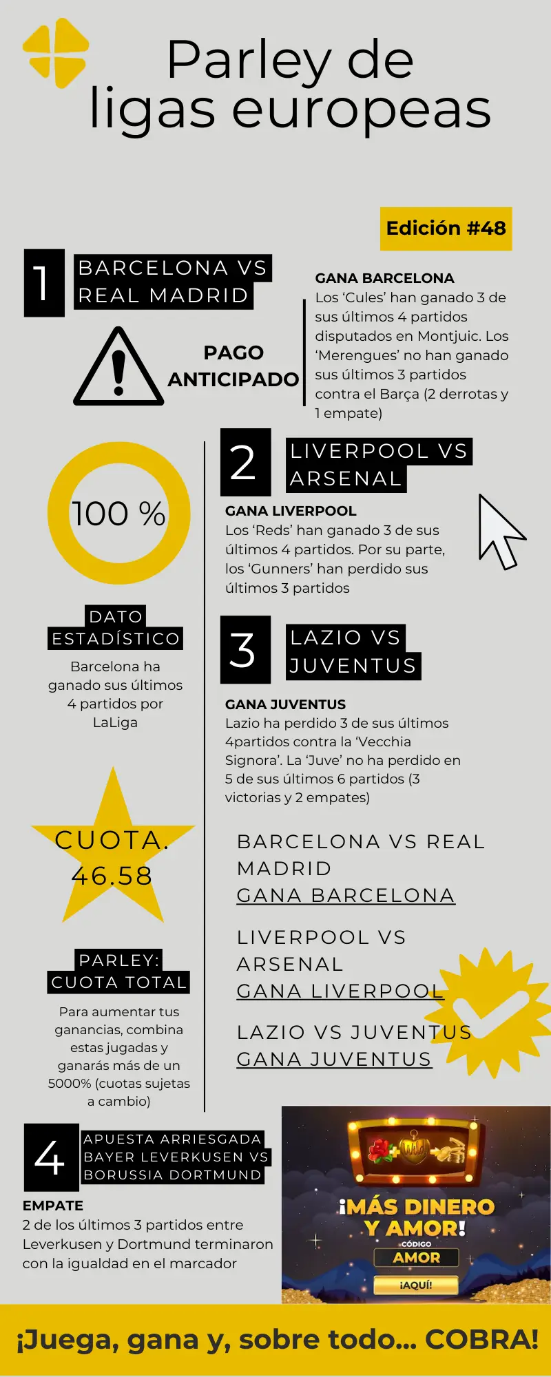 El fútbol no se detiene y este fin de semana la liga europea nos regala enfrentamientos de alto voltaje que pueden definir mucho más que puntos en la tabla: Barcelona vs. Real Madrid y Liverpool vs. Arsenal (ambos, el domingo, 11 de mayo); Lazio vs. Juventus (sábado, 10 de mayo) y el esperado duelo alemán entre Bayern y Dortmund (domingo, 11 de mayo). Aquí en MiCasino.com te traemos un resumen y los pronósticos de la ligas europeas para que sepas cómo apostar.