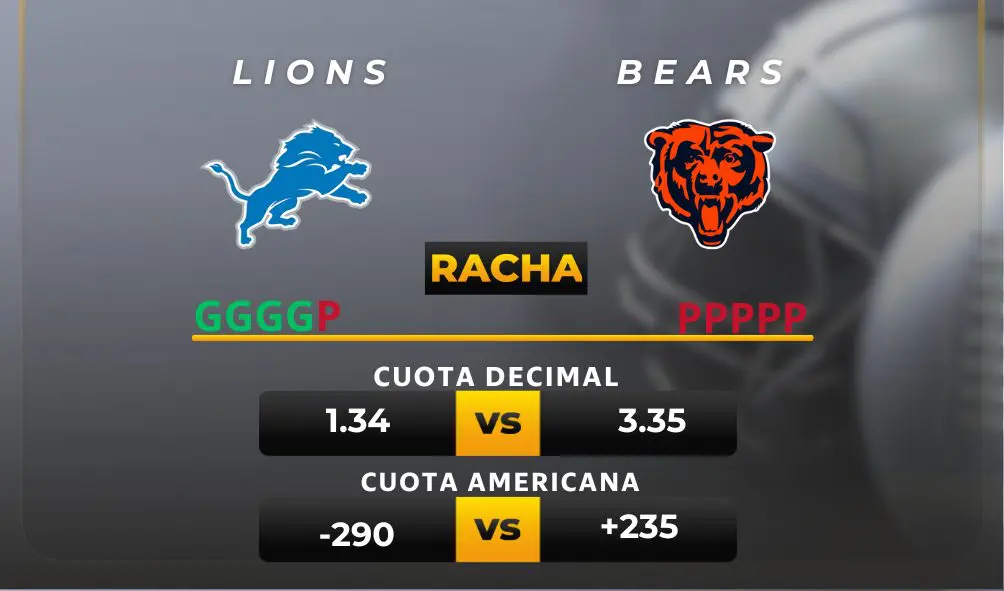 Lions está entre los mejores 4 equipos de toda la liga y aspiran a disputar su primer Super Bowl en su historia el próximo mes de febrero. Pese a que confiamos en que estarán, como mínimo, en el juego de campeonato de la NFC, mantenemos firme nuestra postura de que los Bears encontrarán la manera de sumar su primera victoria desde mediados de octubre. Aquí dejamos los datos que respaldan este pronóstico deportivo y también las cuotas de MiCasino.com para el fin de semana.
