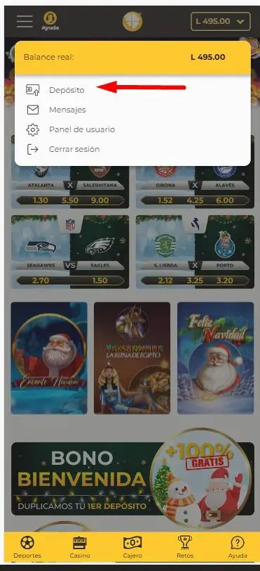 Lo primero que debes hacer es iniciar sesión en MiCasino.com. Luego, deberás pulsar el botón de saldo de la cuenta, ubicado en la parte superior derecha de la pantalla. Al hacer clic se desplegará un menú, de este menú elige “Depósito”. Ten en cuenta que el monto mínimo de depósito para apuestas de casino y deportes es de 20 HNL.