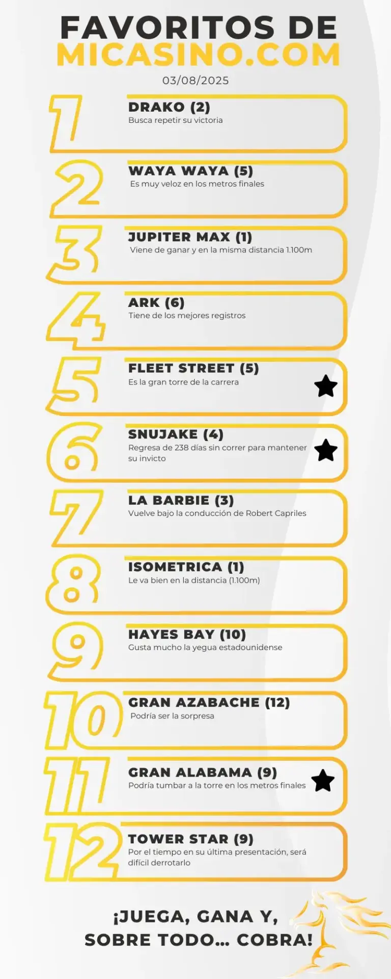 A continuación, te presentamos a los ejemplares más sonados entre la cátedra hípica para esta jornada: