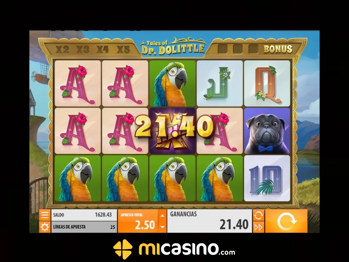 Para finalizar el top 5 de los slots de la semana disponibles en MiCasino.com, te presentamos Slot Tales of Dr. Dolittle, una tragamonedas desarrollada por la firma QUICKSPIN, basado en la historia del personaje literario Dr. Dolittle, un médico que tiene la habilidad de hablar con los animales y se embarca en aventuras emocionantes en sus historias.