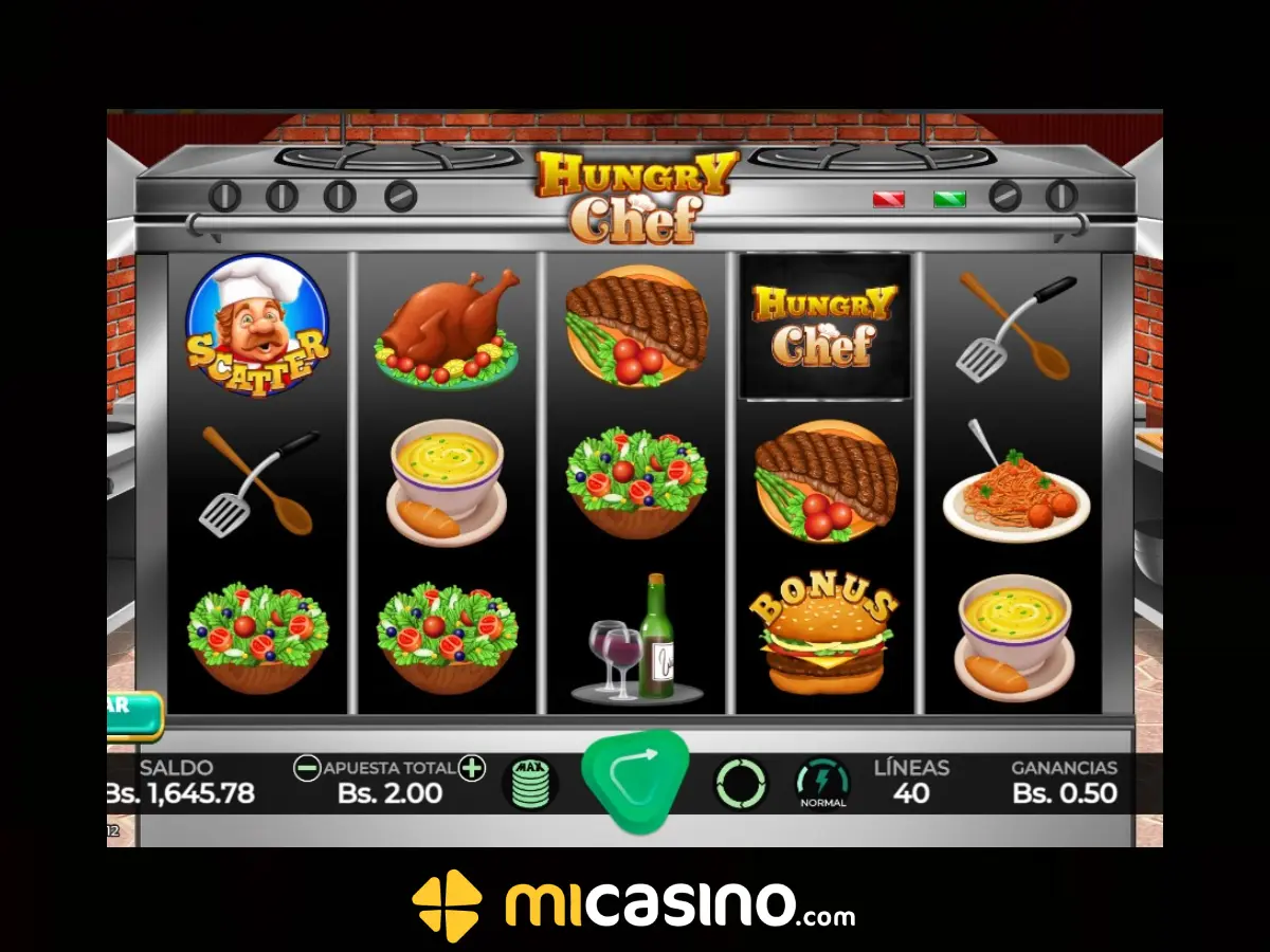 Slot Hungry Chef es un clásico juego de casino online con 5 carretes y 3 filas, que cuenta con un total de 40 líneas de pago al acertar diversos símbolos como un plato de carne, pollo, pescado, pasta, sopa, ensalada, vino, sal y pimienta y utensilios de la cocina.