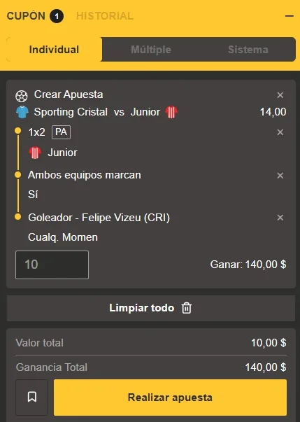 - ¿Cuál es la mejor jugada para el mercado de goles en el Sporting Cristal vs Junior? La opción más sólida es que “Ambos equipos marcan”. Esta tendencia se ha cumplido en 4 de los últimos 5 partidos disputados por cada club, lo que asegura una dinámica ofensiva alta para tu apuesta en MiCasino.