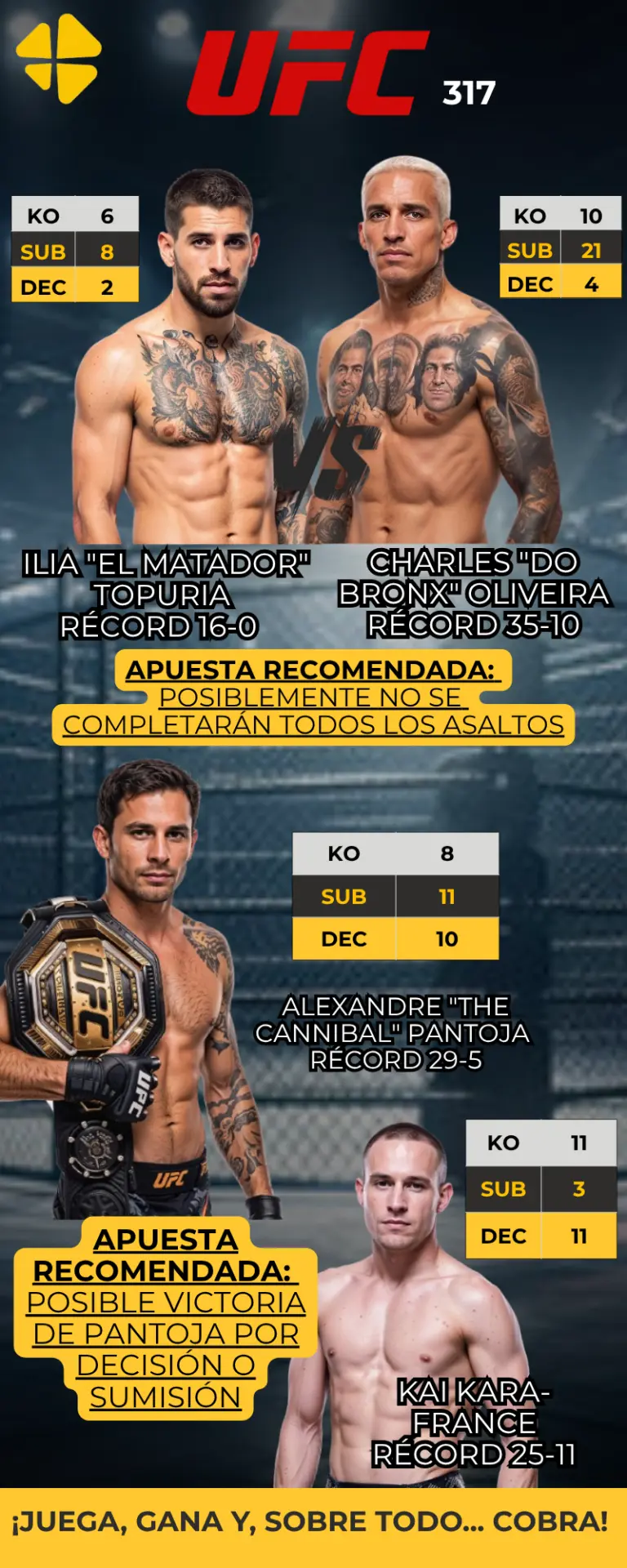 El evento UFC 317 llega cargado de expectativas con Topuria vs. Oliveira como el combate principal de una cartelera que promete acción de principio a fin; un duelo que enfrenta al invicto hispano-georgiano contra un excampeón consagrado, donde ambos buscan consolidarse como el gran favorito del peso ligero. Además, las Apuestas no se detienen ahí, ya que el enfrentamiento entre Pantoja vs. Kara-France también despierta gran interés por sus estilos opuestos y posibilidades estratégicas; una combinación ideal para quienes buscan emoción y análisis en una misma noche. Apuesta en vivo en MiCasino.com y vive la emoción del juego como nunca antes.