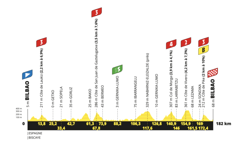 Un perfil repleto de cortas, pero explosivas cotas por la provincia de Bizkaia, seguidos por un quebrado de dientes de sierra que augura una batalla muy abierta en busca del primer maillot amarillo del Tour.