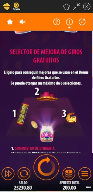 Al obtener giros gratis, verás tres opciones para mejorarlos. Podrás escoger entre lanzar los Wild Dinamita del suministro, activar máximo tres Rodillos Dinamita o conseguir hasta 36 giros gratis para conseguir increíbles ganancias.