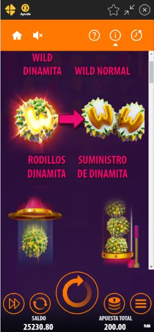 Esta bonificación la puedes activar cuando cae un Wild Dinamita desde un Rodillo Dinamita, luego los Wilds Dinamita del suministro son lanzados uno a uno a los carretes dejando jugosas ganancias.