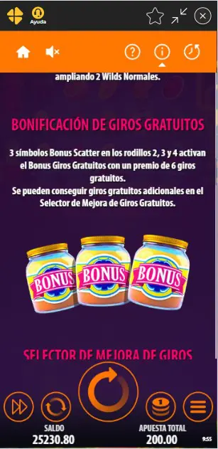 Los giros gratis se activan al conseguir tres bonus en botes de mantequilla de maní que serían el símbolo scatter. Te otorgará seis free spins que podrás mejorar o aumentar.