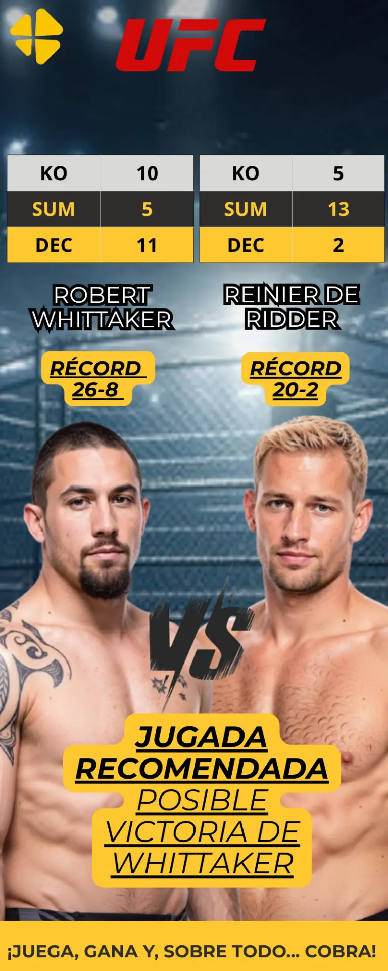 Aunque De Ridder tiene herramientas para neutralizar a sus rivales en el suelo, enfrentarse a un peleador de la talla de Whittaker exigirá más que técnica. La versatilidad, defensa de derribos y capacidad de adaptación del exmonarca lo convierten en el favorito para salir con la mano en alto, especialmente si logra frustrar los intentos del holandés por llevar la pelea a su terreno.